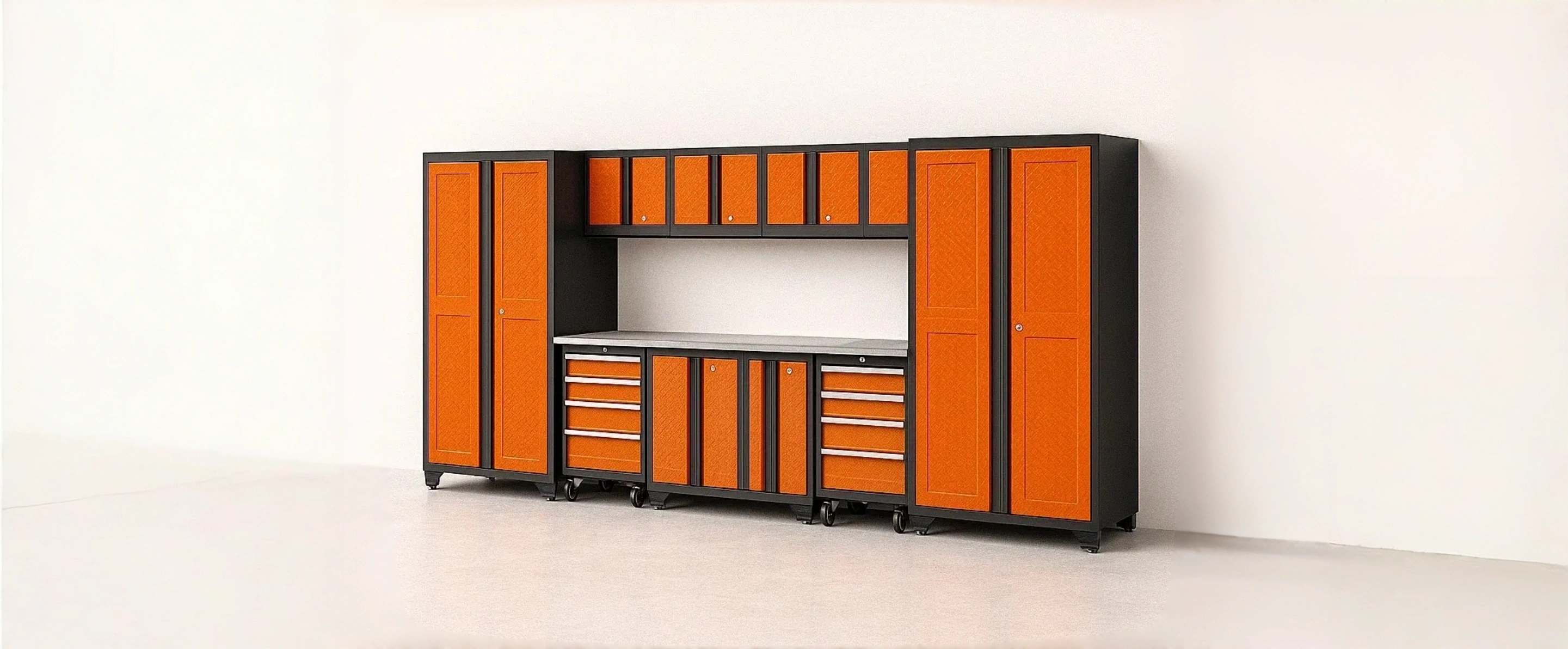 Système de rangement de garage en acier avec armoires et tiroirs orange